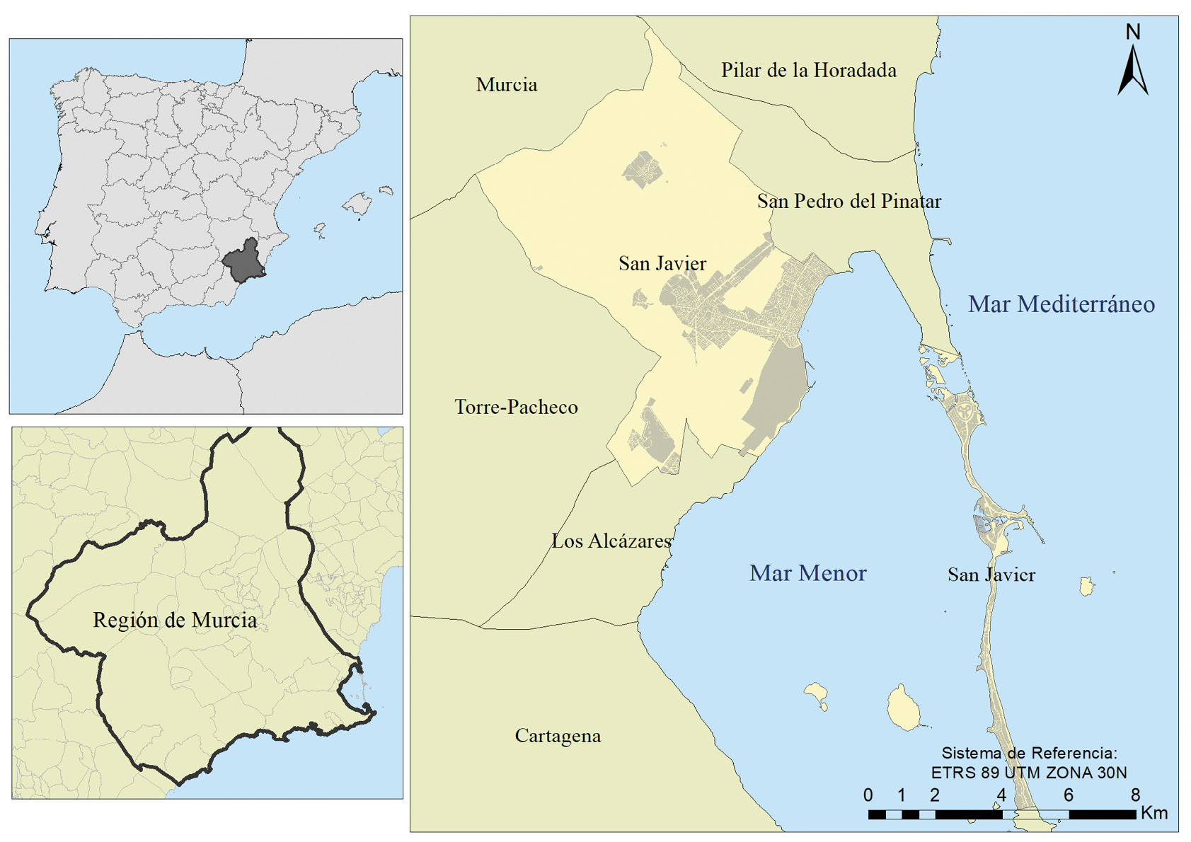 El área de estudio es el municipio de San Javier (Región de Murcia, sureste español). Cabe destacar que una parte de su territorio integra parte del antiguo cordón dunar, concretamente, el sector central de la Manga del Mar Menor (Fig. 1). Por tanto, quedan excluidos los sectores norte (San Pedro del Pinatar) y sur (Cartagena) del área costera. La extensión territorial de San Javier la compone la parte continental, tres islas de origen volcánico (Isla Barón, Isla Grosa e Isla Perdiguera), el islote de Farallón y, como se ha comentado, la parte central de La Manga (Plan General Municipal de Ordenación Urbana de San Javier, PGMO, 2014). En cuanto a las condiciones climáticas, las precipitaciones se caracterizan por su escasez e irregularidad. Teniendo en cuenta la precipitación media de la región, estas oscilan entre los 200-400 mm concentradas en los meses otoñales. Para el caso de San Javier, cabe indicar que cuenta con un observatorio meteorológico ubicado en el aeropuerto militar ascendiendo la media de precipitación anual a 313 l/m². En relación con las temperaturas, la cifra media es de 17,6ºC, siendo los meses de verano (julio y agosto) los que registran temperaturas más elevadas (25ºC de media), llegando a superar frecuentemente los 30ºC de temperatura máxima (Agencia estatal de Meteorología, AEMET, 2019).