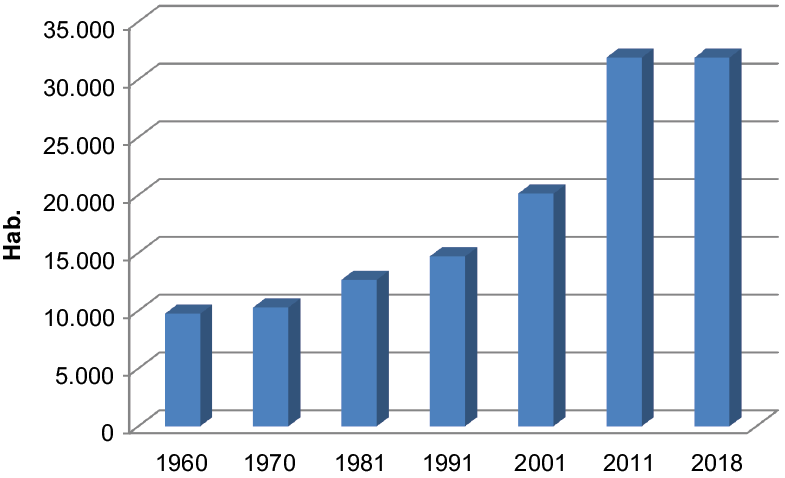 El proceso de urbanización acaecido también originó a partir de los años sesenta y setenta un importante crecimiento demográfico en los municipios del litoral mediterráneo. Este proceso provocó que durante los primeros años la población de los municipios de interior fuera en detrimento de los costeros. La realidad de la ciudad de Murcia (capital de la región) es muy diferente a la de San Javier, y ello también se refleja en sus cifras. Al analizar la variación porcentual de los dos últimos periodos, se observa que San Javier presenta un aumento demográfico bastante más significativo. Entre 2001 y 2011 la población aumenta en San Javier en un 59% mientras que en Murcia el 18%. Los últimos datos del padrón de habitantes indican que hay un total de 31.905 habitantes (Fig. 2).
