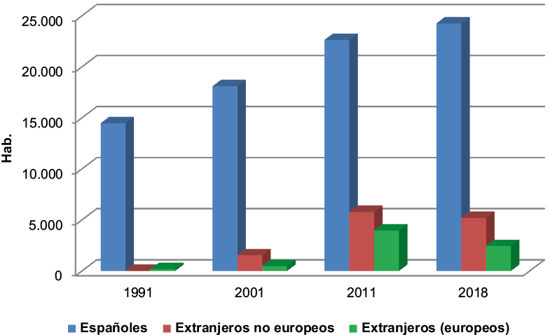 Respecto a la población inmigrante, hasta 1991 se asentaban un mayor número de extranjeros europeos que no europeos. Es a partir de 2001 cuando la llegada de este contingente poblacional aumenta. Mientras que, en la década de los noventa, el número de extranjeros no superaba los 190, a partir de esta fecha las cifras oscilan entre los 7.000 y 9.000 habitantes. En 2011 el porcentaje de inmigrantes representaba el 30% de la población total, siendo el 18% de origen no europeo. Según datos del INE de 2018, en San Javier se han visto reducidas estas cifras entre 2011-2018. Actualmente existen un total de 7.655 inmigrantes (el 24% de la población total). De ellos, 2.442 son europeos. (Fig. 3). Lo mismo sucede en otros municipios del este peninsular como en Teulada (58,87%), Calpe (52,27%) o Benissa (38,78%) (Morote & Hernández, 2017).