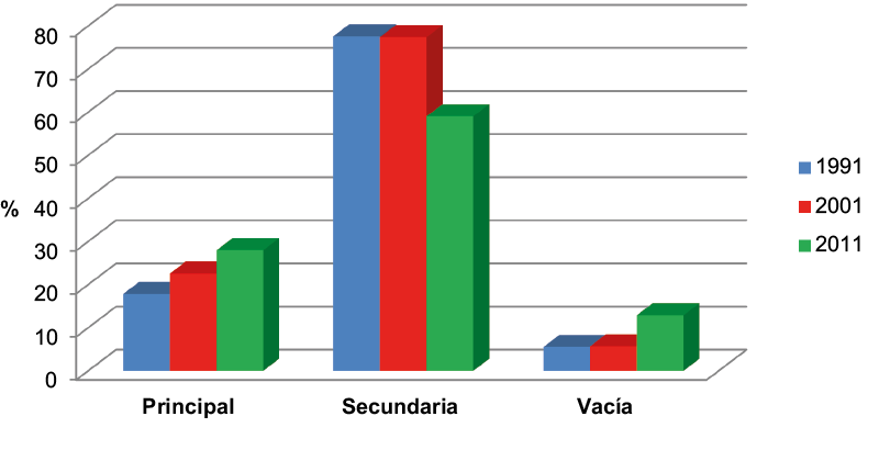 Fig. 5/ Evolución del porcentaje de viviendas de San Javier según el tipo de ocupación (1991-2011).