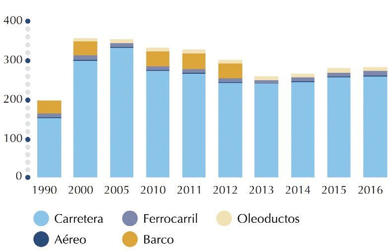 Desde 1990 a 2016 el aumento de la movilidad interior de mercancías en España ha sido en torno del 50% (ver Fig. 1). El aumento se ha centrado principalmente en el transporte de mercancías por carretera, que creció en términos absolutos representando el 92% del total en España manteniéndose casi constante la cifra de transporte de mercancías por ferrocarril.