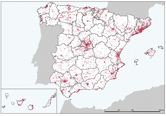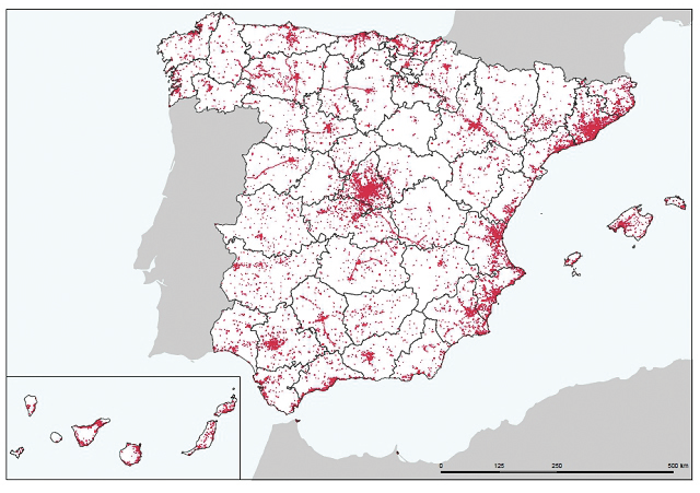 Fuente: Delgado, 2012:504, elaboración a partir de los datos del proyecto Land Cover del programa CORINE de la Agencia Europea de Medio Ambiente (AEMA) – European Environment Agency (EEA), para datos de la Comunidad de Madrid y de OSE (2010) para datos de España.