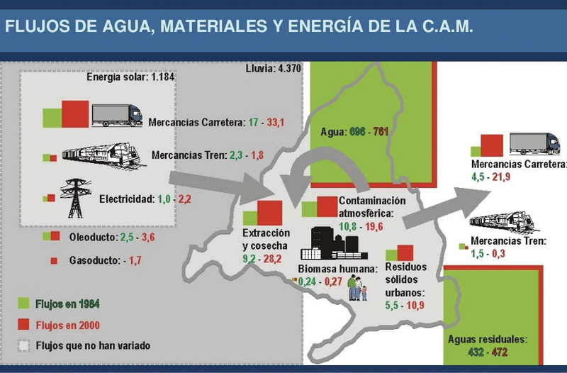 Fig. 4/ Flujos de agua, materiales y energía de la Comunidad de Madrid, 1984, 2000.