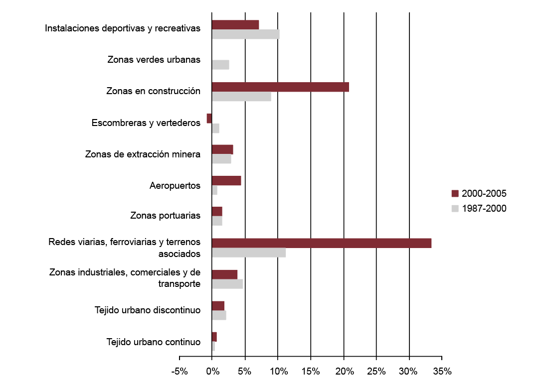 En el periodo reciente 1987-2006 han crecido fuertemente las superficies artificiales en España con un 46,5%, pero más lo han hecho las infraestructuras, con un 166%, lo que supera el crecimiento de las zonas industriales y comerciales, con un 19%. Es decir, la superficie artificial ocupada por infraestructuras es lo que más ha aumentado, o lo que es lo mismo, las redes viarias, ferroviarias y los terrenos asociados.