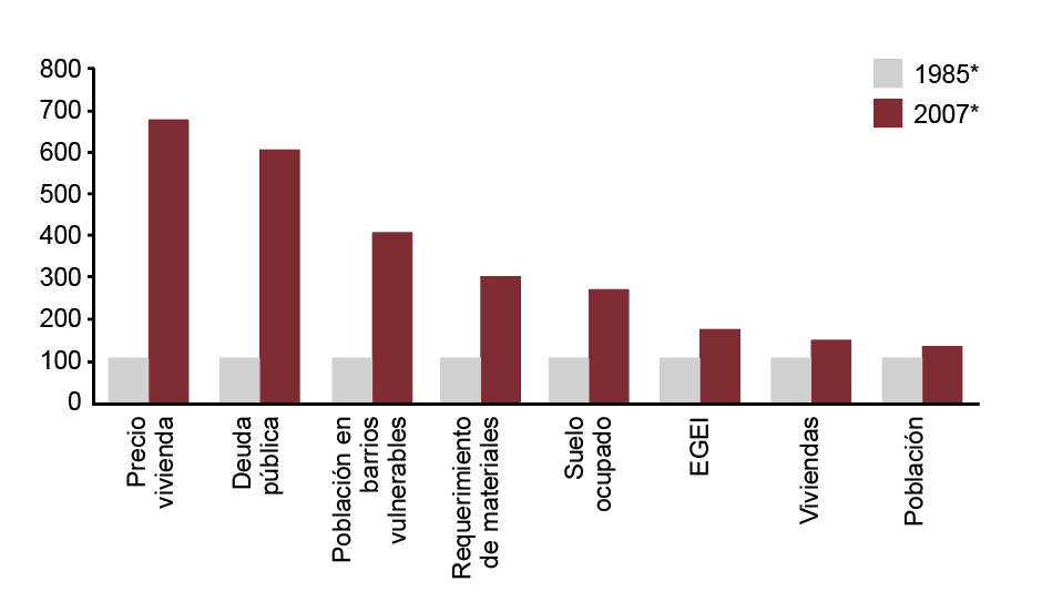Fig. 10/ Evolución de indicadores clave para el análisis de la Región Metropolitana de Madrid: población, viviendas, precio de la vivienda, superficie artificial, usos urbano- industriales, suelo ocupado, deuda pública, población en barrios vulnerables, requerimiento de materiales, emisiones de gases de efecto invernadero, 1985-2007, Año 1985=base 100.
