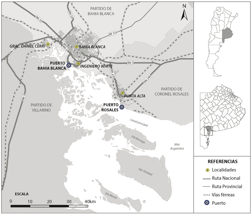 El análisis de este trabajo se centra en una zona de transición entre la región Pampeana y Patagónica. Específicamente el área de estudio comprende los partidos de Bahía Blanca y Coronel Rosales en el Sudoeste de la Provincia de Buenos Aires. Este espacio pertenece al estuario de planicie costera de Bahía Blanca5, el cual representa la transición de los ambientes de aguas continentales a los marinos. El canal principal del estuario da acceso al mayor sistema portuario de aguas profundas que viabiliza conexiones con mercados externos, a partir del complejo de puertos de Bahía Blanca (Ingeniero White, Galván, Cuatreros) y Rosales (Perillo & Piccolo, 2004). Además de estos puertos comerciales el área cuenta con el Puerto Belgrano que oficia como base naval militar. Sobre la franja costera del estuario se emplazan las ciudades de Bahía Blanca (301.572 hab.), Punta Alta (62.000 hab.), Ingeniero White (10.486 hab.) y General Cerri (6.745 hab.), siendo Bahía Blanca la de mayor jerarquía, la cual concentra las principales funciones económicas y administrativas del Sudoeste bonaerense (Instituto Nacional de Estadísticas y Censos, 2010).