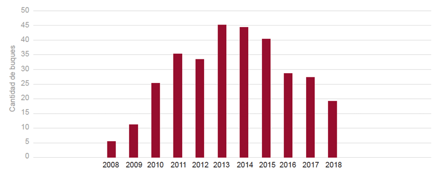 Fig. 4/ Evolución de los buques de GNL ingresados en el puerto de Bahía Blanca entre 2008-2018.