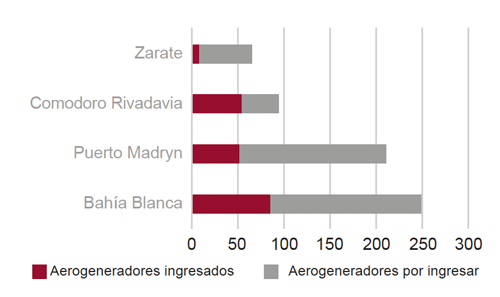 La mayoría de los proyectos eólicos han optado por importar aerogeneradores del orden de los 3 a 3.5 MW de los principales fabricantes del mercado europeo como Vestas y Nordex Group como así también del tecnólogo chino Goldwind. Dichos equipos han comenzado a ingresar al país desde fines del año 2017 a través de los puertos de Bahía Blanca (Buenos Aires), Puerto Madryn (Santa Cruz) y Comodoro Rivadavia (Chubut) principalmente. Hasta agosto del 2018, 204 aerogeneradores ingresaron y otros 418 arribarán entre fines del 2018 y principios de 2019 (Fig. 5).