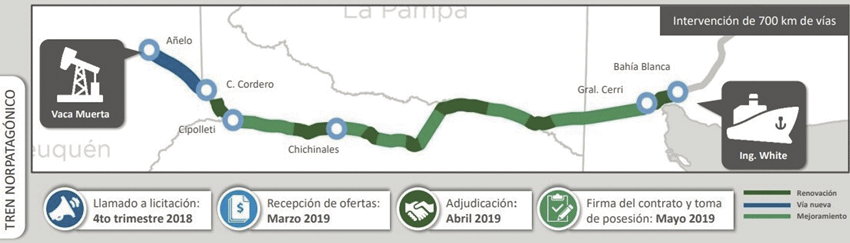 Conectar Bahía Blanca con Añelo (Neuquén), ciudad que se ha convertido en núcleo de servicios a la producción de hidrocarburos no convencionales, requiere de un trazado férreo que hoy existe parcialmente, con tramos en buen estado y otros muy deteriorados. Por este motivo se busca poner en operatividad 700 kilómetros de vías, lo cual supone una inversión de 570 millones de dólares. A fines de 2018, el Ministerio de Transporte de la Nación busca realizar el llamado a licitación del proyecto Tren Norpatagónico a través del sistema de Participación Público Privado (PPP). Esta estratégica obra incluye el mejoramiento de 374 km, la renovación de 208 km y la construcción de una nueva traza de 83 km (Fig. 9). Se estima un plazo de aproximadamente cuatro años para completar la totalidad de estas obras, que para su primer año de operación estaría en condiciones de transportar 1,5 millones de toneladas de carga. Las cargas transportadas no sólo serán en sentido Bahía Blanca-Añelo, sino que también se proyecta el transporte de producción regional, como peras y manzanas.