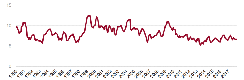 Fig. 2/ Tasa de desempleo entre 1990 y 2017 en Región Metropolitana de Santiago.