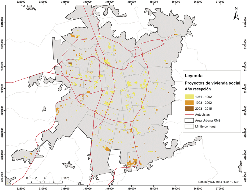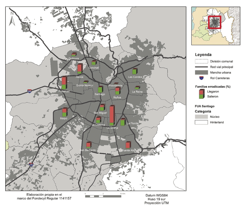 Un catastro elaborado por la Secretaría Ministerial de Vivienda y Urbanismo de la Región Metropolitana, detectó más de 294 asentamientos irregulares que servían de habitación para más de 44 mil familias y casi 223 mil personas. Hidalgo (1999), plantea que solo entre 1979 y 1986 se erradicaron más del 60% de las familias que habitaba campamentos, las que accedieron a viviendas sociales nuevas en la periferia de la ciudad, en municipios que no contaban con infraestructura ni medios como para recibir a estos nuevos habitantes, consolidando una ciudad con una estructura polarizada. El nuevo sistema de subsidios habitacionales fue muy eficiente en términos cuantitativos, ya que solo entre 1978 y 1995 se construyeron casi medio millón de viviendas.