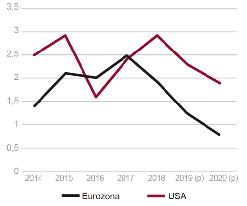 El crecimiento de la Eurozona se desacelerará, pasando del 1,2% en 2019 hasta un 0,8% en 2020 (Fig. 1). La evolución de la economía europea también dependerá del resultado de las negociaciones sobre la salida del Brexit entre la Unión Europea y el Reino Unido.