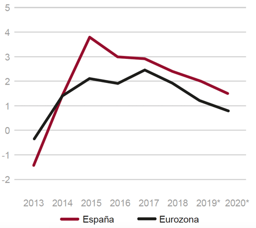 La economía española ha registrado durante seis años (2014-19) un ritmo de crecimiento significativo (2,6% fue el crecimiento medio de dicho periodo), superior a la Eurozona (1,8%). Dicha evolución ha estado acompañada de una fuerte creación de empleo y por la presencia de superávit en la balanza corriente.