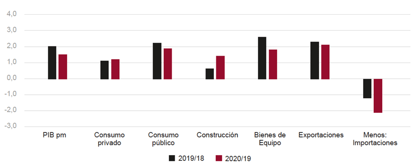 Fig. 3/ PIB y componentes de la demanda. Tasas de variación anual, 2019-2020 (previsión) (%).