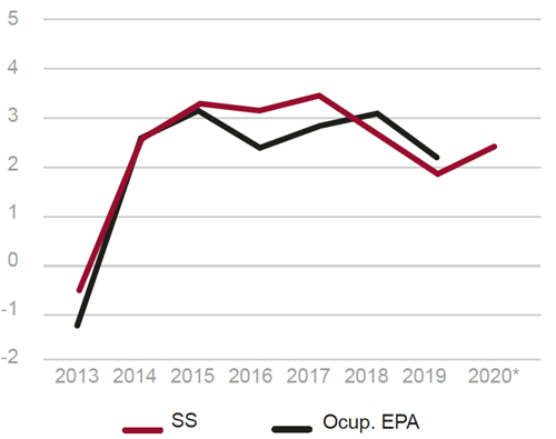 Fig. 4/ Empleo, España. Variaciones anuales del empleo, según la EPA y según la Afiliación a la Seguridad social, 2013-2020 (previsión) (%). Datos a fin de año.