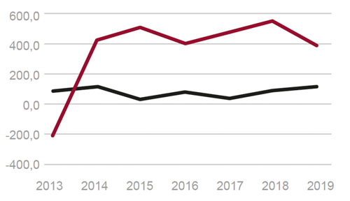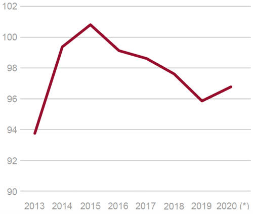 La balanza de pagos por cuenta corriente mantuvo un superávit del 1,9% del PIB, correspondiente a 23.941 millones de euros, según datos del Banco de España. Dicha magnitud fue similar a la del año anterior. En 2019 el déficit del conjunto de las administraciones públicas equivalió al 2,5% del PIB, superior a la previsión realizada al inicio del año. El peso de la deuda pública en el PIB descendió ligeramente hasta el 95,9% en 2019 (Fig. 5).