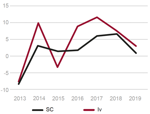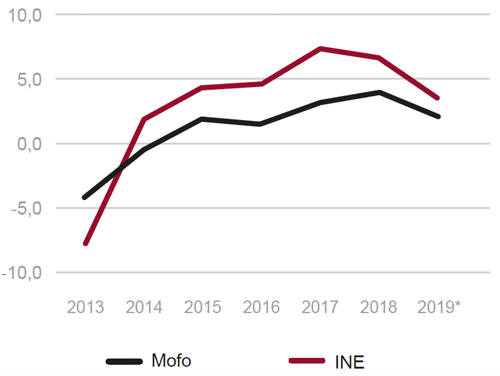 En 2019 se desaceleró el ritmo de crecimiento, consecuencia tanto de la evolución de la demanda interna como de la demanda exterior neta. El crecimiento del PIB en 2019 fue el 2,0% (2,4% en 2018), superior al 1,2% de la Eurozona (Fig. 2). En el ejercicio de 2019 destacó la desaceleración del crecimiento de la demanda interna, que pasó de crecer desde el 2,7% de 2018 al 1,5% en 2019. Destacó la desaceleración de la formación bruta de capital y el más bajo crecimiento de la construcción, donde fue importante la evolución negativa de la construcción no residencial (Fig. 3).