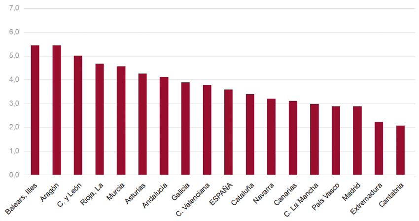 Por comunidades autónomas, el aumento mayor del índice de precios en 2019 correspondió a Baleares (5,5%) y el menor a Cantabria (2,1%). En algunas zonas de fuertes crecimientos en los años anteriores la desaceleración resultó más acusada, como fue el caso de Madrid (2,9%) y País Vasco (2,9%) (Fig. 7).