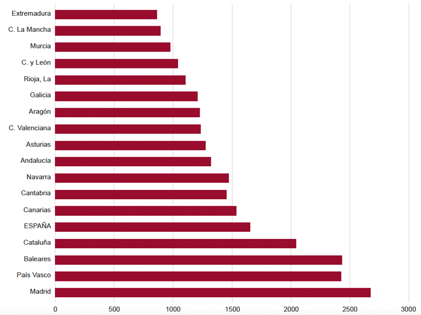 El precio medio de tasación de las viviendas ascendió a 1.652,8 euros/m2 en el cuarto trimestre de 2019. Los precios absolutos más elevados (Fig. 8) fueron los de la C. de Madrid (2.671,7 euros/m2) y País Vasco (2.434,4 euros/m2). Los niveles más reducidos de precios fueron los de Castilla-La Mancha (888 euros/m2) y Extremadura (858,5 euros/m2). El importe medio de las hipotecas registradas sobre vivienda fue de 125.007 euros, lo que supuso un aumento del 0,6% sobre el nivel de 2018. El importe medio citado supuso un aumento del 24,9% sobre el nivel correspondiente a 2013, que fue el año previo al inicio de la recuperación del mercado de vivienda.