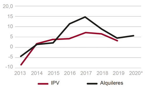 Fig. 9/ Alquileres y precios de vivienda. Tasas de variación anual (%), 2013-2020.