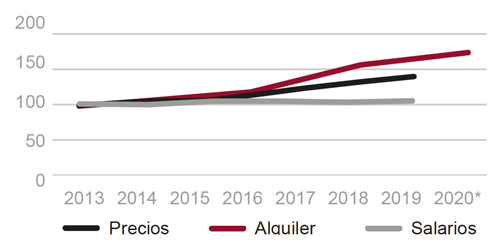 Los alquileres de viviendas se situaron en un nivel medio en España de 10,9 euros/m2-mes en diciembre de 2019, lo que supuso una variación del 4,8% en dicho año. Esta evolución supuso una desaceleración respecto del 9,1% registrado en 2018. Por cuarto año consecutivo el aumento de los alquileres en 2019 superó al de los precios de venta de las viviendas.