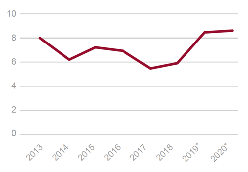 La renta disponible de los hogares creció en un 4,2% en los tres primeros trimestres de 2019, por encima del aumento de 2019. La aceleración del aumento de la renta disponible de los hogares resultó contrarrestada, a efectos de gasto en consumo, por un aumento de la tasa de ahorro familiar sobre la renta disponible, que pasó desde el 5,4% en 2018 al 8,4% en 2019 (Fig. 12). La Comisión Europea ha anticipado para 2020 una nueva elevación de dicha tasa, lo que afectará de forma negativa al consumo, pero no a las compras de viviendas.