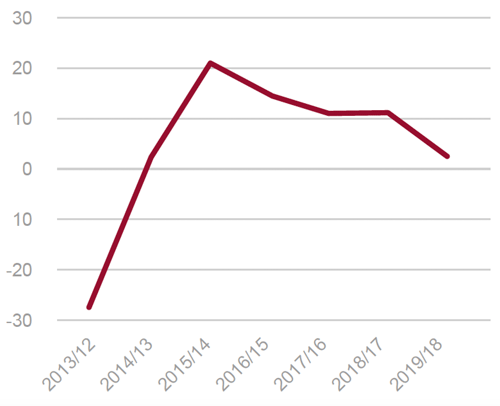 Fig. 13/ Número de hipotecas registradas sobre vivienda, tasas interanuales, 2013-2019 (%).