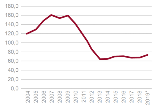 El empleo en la construcción creció en todo el año en un 0,3%, según la Encuesta de Población Activa, lo que contrastó con el aumento del 11,9% registrado el año precedente. La construcción alcanzó en 2019 una participación en el PIB del 10% por el lado de la demanda, participación que era del 8,7% en 2013, año previo al inicio de la recuperación de la economía y del mercado de vivienda (Fig. 22).