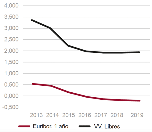 El tipo medio de interés de los préstamos a comprador de vivienda se situó en 2019 en el 1,935%. El índice de referencia más utilizado, el Euribor a doce meses, alcanzó un nivel medio del -0,218% (Fig. 16). El diferencial medio aplicado sobre el Euribor ascendió al 2,15%.