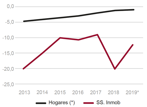 Fig. 17/ Crédito a hogares para compra de vivienda y crédito a promotor inmobiliario. Tasas de crecimiento interanual de los saldos vivos a fin de año (%), 2013-2019.
