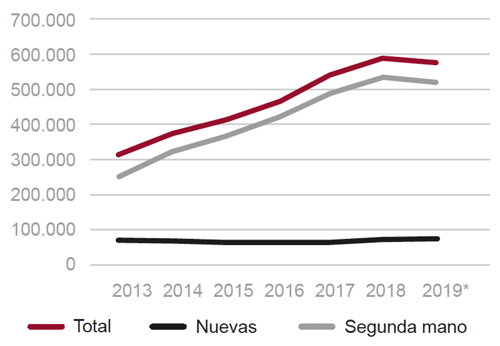 Fig. 19/ Transmisiones inmobiliarias, total viviendas, nuevas y de segunda mano. Totales anuales (miles), 2013-2019.