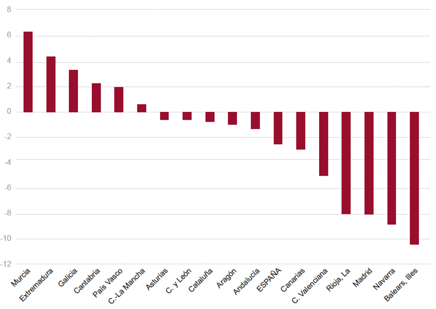 Por autonomías, el mayor aumento de las ventas de viviendas tuvo lugar en Murcia (6,4%), seguida por Extremadura (4,3%), mientras que el descenso más acusado fue el de Baleares (-10,4%) (Fig. 19).