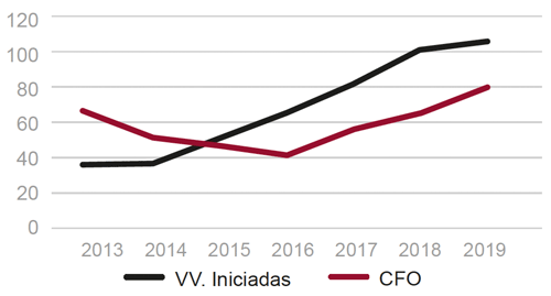 Fig. 20/ Viviendas iniciadas (visados de obra nueva) y terminadas (certificados de fin de obra). Totales anuales, 2013-2019.