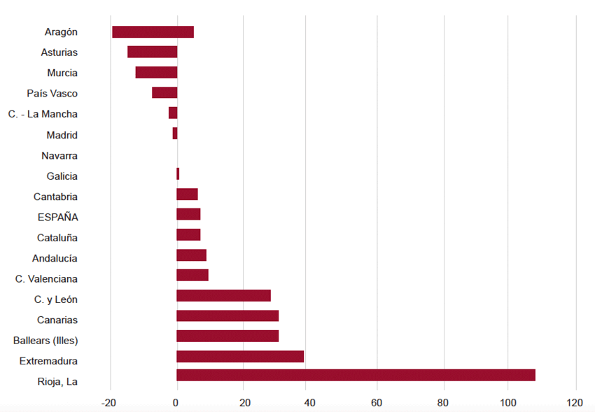 En todo el año 2019 los mayores crecimientos de las viviendas iniciadas se produjeron en Rioja (107,5%) Extremadura (38,3%). Los descensos más acusados en la evolución de dicha variable tuvieron lugar en las autonomías de Asturias (-15,1%) y Aragón (-19,5%) (Fig. 21). Los niveles más elevados de iniciación de nuevas viviendas correspondieron a la Comunidad de Madrid, con 22.130 viviendas iniciadas, seguida por Andalucía (21.116) y Cataluña (13.796).