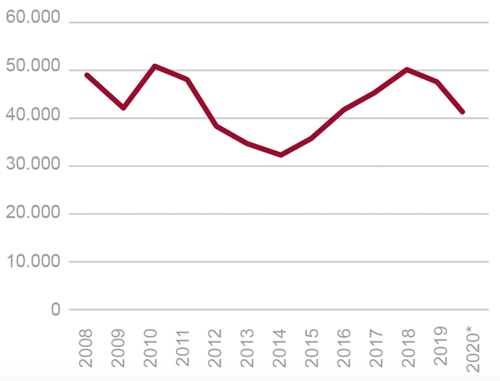 Fig. 23/ Compraventas registradas de viviendas de protección oficial (VPO). Totales anuales, 2008-2020 (previsión).