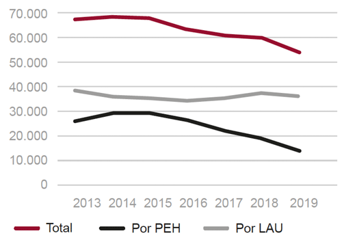 Fig. 24/ Lanzamientos judiciales practicados. Total, por ejecución hipotecaria y por impago de alquileres (LAU). Series anuales, 2013-2019.