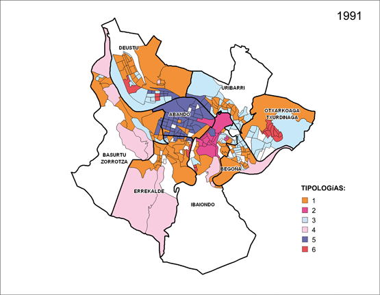 Por último, se mantiene, aunque ha mejorado su aspecto físico, una zona representada por barrios situados en la antigua periferia de la ciudad industrial (Otxarkoaga, Peñascal, Uretamendi) y que presentan todas las características de barrios en crisis, en riesgo de “guetización”. En el periodo analizado, la Administración pública (Gobierno Central, Gobierno Vasco y Ayuntamiento de Bilbao), directamente a través de paternarios (Bilbao Ría 2000) y sociedades públicas (Visesa), se ha comportado un auténtico “promotor habitacional” y ha contribuido de manera significativa a la distribución de la población en la ciudad (re) construida y, en cierta medida, a la segregación socioresidencial.