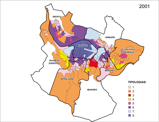 Se mantiene la importancia de la dimensión socioeconómica como factor de diferenciación residencial que, incluso, incrementa su capacidad explicativa. A continuación destaca un factor sociodemográfico que, básicamente, está relacionado con el envejecimiento de sus habitantes39 en determinadas zonas de la ciudad frente a la creación de nuevos hogares en las áreas de la expansión de la ciudad40. En cuanto a las tipologías residenciales que dibujan el mosaico urbano, se mantiene la diferenciación centro-periferia, aunque con algunas diferencias significativas. Existe una zona central (tipología 1) donde las clases medias–altas y altas según establecen los indicadores socioeconómicos, incrementan los ingresos medios en términos de renta familiar41. La periferia se fragmenta (tipologías 5 y 7) en términos socioresidenciales debido a que es donde existen las mayores reservas de suelo público y donde se produce el mayor incremento del parque de vivienda de V.P.O. La periferia tradicional de “la vieja ciudad industrial” está representada por la tipología 4. Han surgido nuevos espacios de “transición” donde conviven antiguos y nuevos residentes, nuevos hogares que han ido ocupando los pisos vacíos de personas avanzadas a precios asequibles, es decir, se produce una reposición del parque de vivienda.