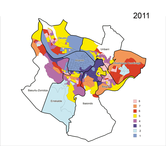La confluencia de dos factores –agotamiento de las reservas de suelo público, y la crisis inmobiliaria– ha dirigido la mirada de la intervención urbana a la ciudad construida, tal como se recoge en la renovación del actual Plan General de Ordenación Urbana Bilbao en fase de avance. El Plan se basa en dos premisas: intervenir sobre aquellas parcelas que quedan libres en el suelo urbano consolidado, incrementando sus densidades de edificabilidad y actuar sobre barrios vulnerables a través de políticas de rehabilitación de edificios y viviendas. En el mercado de la rehabilitación urbana, a diferencia de los noventa, adquieren mayor importancia los aspectos relacionados con la sostenibilidad energética, los factores ambientales (aislamientos, paneles solares, etc.) y la movilidad de grupos “vulnerables” (rampas de acceso, ascensores, etc.). En este nuevo contexto socioeconómico y de renovación urbana, el estudio del proceso de diferenciación socioresidencial en Bilbao (2011) que presentamos es una continuación del análisis realizado en 1991 y en 2001 (Antolín & al, 2010).