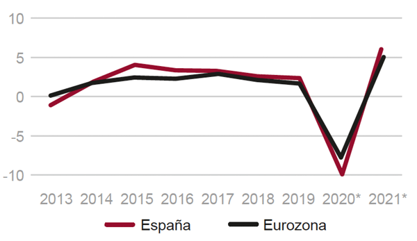 Fig. 2/ España y Eurozona. Tasas de crecimiento anual del PIB, precios constantes, 2013-2021 (previsión).