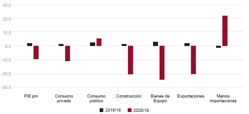 El impacto negativo de la pandemia se va a advertir en el comportamiento de la inversión en capital fijo, destacando las caídas previstas en la construcción (-20,5%) y en la inversión en bienes de equipo (-24,3%). Solo el consumo público presentará una tasa de variación positiva dentro de la demanda (Fig. 3).