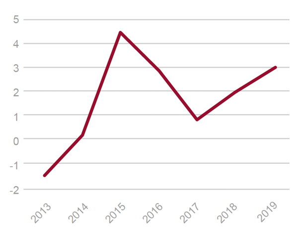 Fig. 12/ Renta Bruta deflactada de los hogares. Tasas interanuales, 2013-2019.