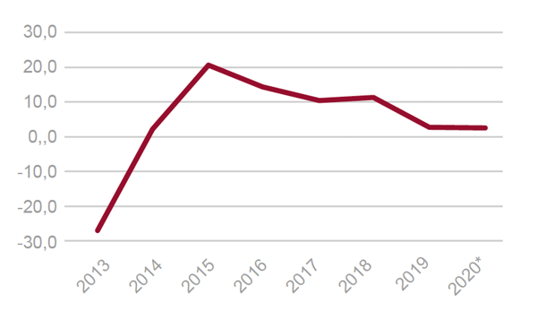 Fig. 13/ Hipotecas registradas sobre viviendas. Tasas de variación anual, 2013-2020 (previsión).