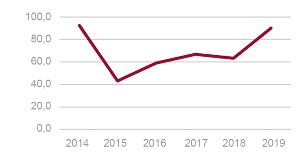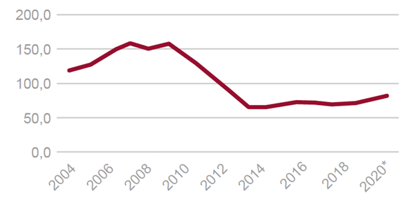 Fig. 5/ Deuda Pública/PIB (%). Datos a fin de año, 2013-2020 (previsión).