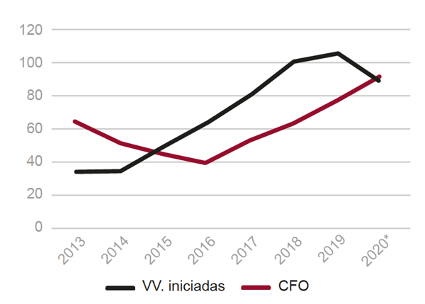 Fig. 19/ Viviendas iniciadas (visados de obra nueva) y terminadas (certificados de fin de obra). Totales anuales, 2013-2020 (previsión).