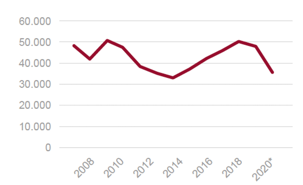 Fig. 22/ Compraventas registradas de viviendas de protección oficial (VPO). Totales anuales, 2008-2020 (previsión).