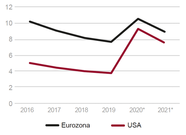 Las previsiones de abril de 2020 del FMI apuntan a una caída del PIB mundial del 3% en 2020, a la que sucedería una recuperación del 5,8% en 2021. El descenso de la actividad en los países de economías avanzadas seria del 6,1% en 2020, y en el caso de los países de economías emergentes dicho retroceso seria del 1,0%. La Unión Europea ha entrado así en la recesión económica más profunda de su historia, con la particularidad de que el descenso citado ha tenido lugar en unas pocas semanas (Comisión UE, 2020). Los retrocesos de la actividad van a ser más acusados en la Eurozona que en Estados Unidos (-7,5% sería la caída del PIB en la Eurozona en 2020, mientras que en Estados Unidos el retroceso se situaría en el 5,8%) (Fig. 1). La tasa de desempleo puede alcanzar el 10,4% en 2020 en la eurozona y un 9,2% en Estados Unidos (Fig. 1.bis). Los niveles de desempleo alcanzados en el segundo trimestre de 2020 han debido ser los mayores de todo el periodo de recesión iniciado en dicho periodo.
