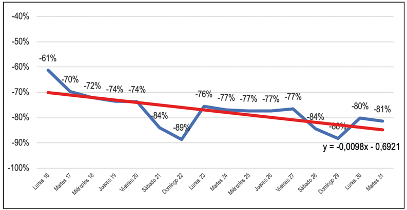Fig. 1/ Evolución de la intensidad de la movilidad en Málaga, marzo 2020.