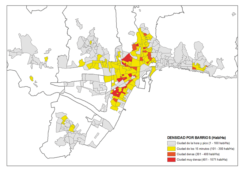 Como se puede apreciar en el gráfico de secciones censales la ciudad de proximidad en Málaga, la de las tramas amarillas de 101 a 300 habitantes por hectárea ocupa un espacio pequeño en comparación con el conjunto del suelo urbanizado. La mayor parte del territorio tiene una densidad inferior a 100 habitantes por hectárea, lo que conocemos como ciudad dispersa. La ciudad densa y muy densa, las tramas naranjas y rojas, se localizan en los ámbitos del gran crecimiento urbano de los años sesenta y setenta.