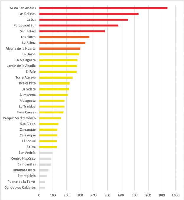 Fig. 7/ Densidad hab./ha en algunos barrios de Málaga.